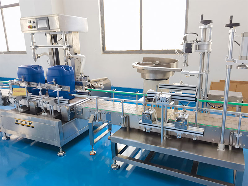 全自動(dòng)稱重式灌裝機(jī)械的核心工作方式,主要是以重量定體積,以此不受物料密度、溫度、粘度變化影響,以此確保灌裝精度的統(tǒng)一性,工作人員在18公斤稱重灌裝機(jī)的顯示屏幕內(nèi)設(shè)定好灌裝參數(shù)規(guī)格,輸送帶會(huì)將空的容器桶送至灌裝工位,氣動(dòng)擋桶機(jī)構(gòu)于定位裝置會(huì)在協(xié)同的作用下將其卡定在下料處,稱重傳感裝置將實(shí)時(shí)檢測(cè)空桶內(nèi)的重量信息,并將灌裝的數(shù)據(jù)反饋至PLC控制系統(tǒng)內(nèi),自動(dòng)進(jìn)行記錄并扣除桶重,灌裝閥在開啟的那一刻,按雙速灌裝模式進(jìn)行物料輸送,當(dāng)達(dá)到慢灌閾值時(shí),PLC控制灌裝閥切換流量,當(dāng)重量達(dá)到18公斤設(shè)定值時(shí),立即關(guān)閉灌裝閥,完成灌裝。